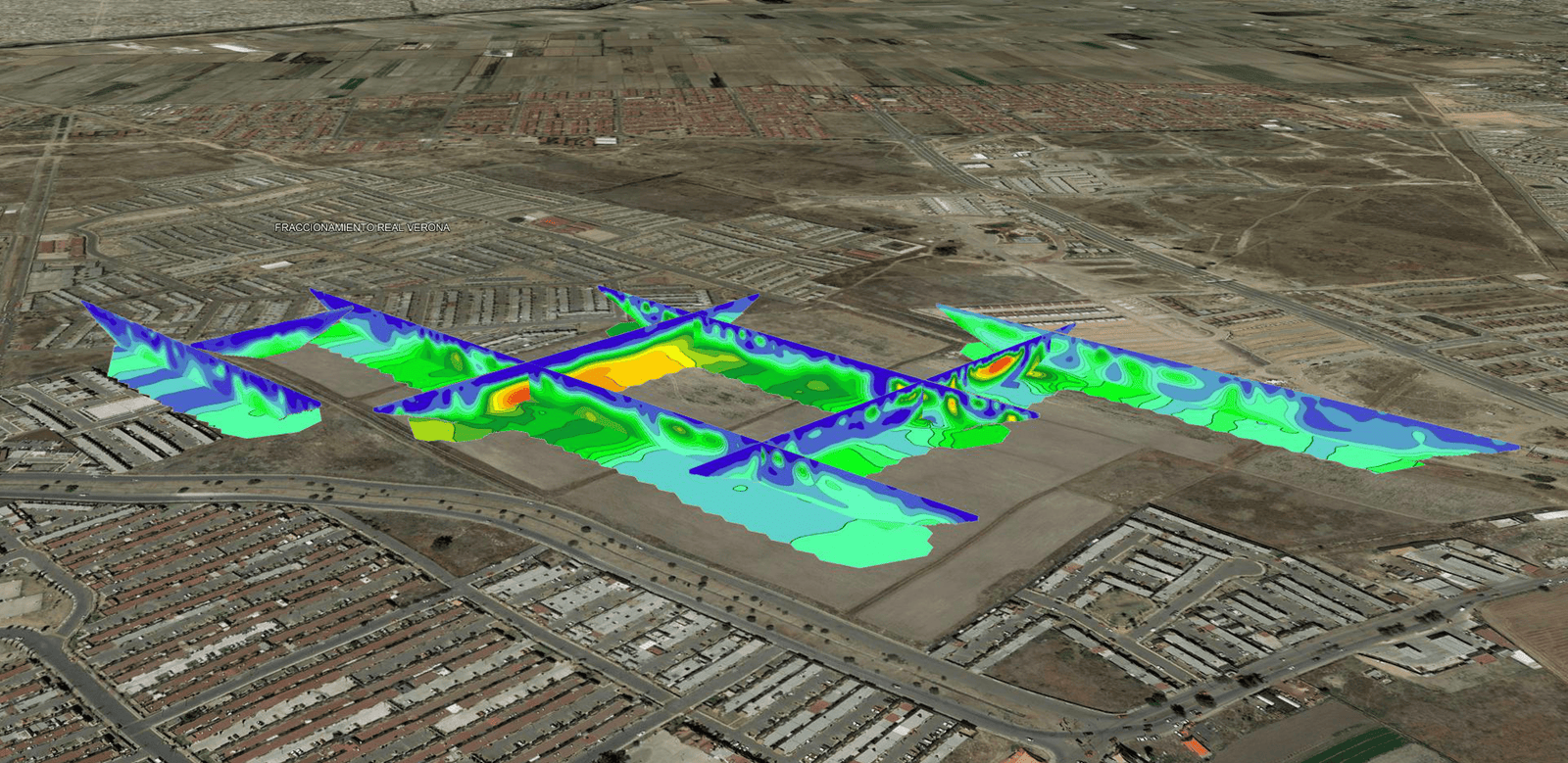- - Geofísico: Tiene como objetivo identificar anomalías que puedan asociarse a posibles cavidades, fallas, agrietamientos, discontinuidades o zonas susceptibles a asentamientos diferenciales (subsidencia) dentro del predio de interés.